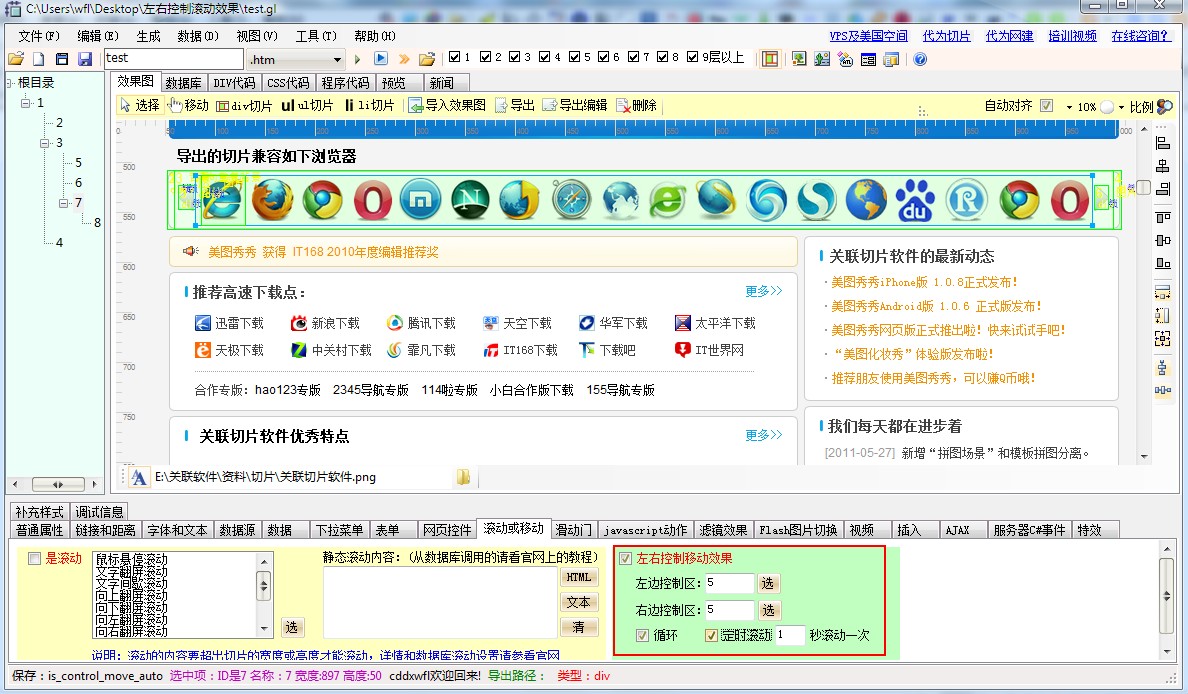 第五步:选择7号切片,在下面的属性设置区中的【滚动或移动】中【左右控制移动效果】打勾表示,需要生成这个层的左边控制移动效果。接着再设置【左边控制区】和【右边控制区】,如下图所示: