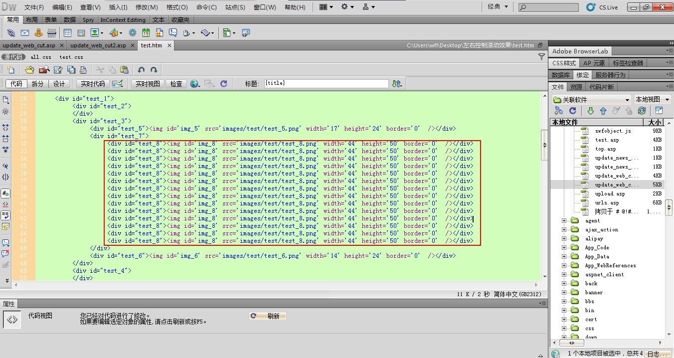 第六步:生成并导出,现在可以看到还不能滚动,是因为滚动区内的项目太少了,里面的内容必须要超过滚动区的宽度才会滚动,这时候我们可以在dreamwaver中复制多个模板项,保存再预览就可以了。如下图,把“test_8”这个div复制多个,保存一下,再预览就可以了。